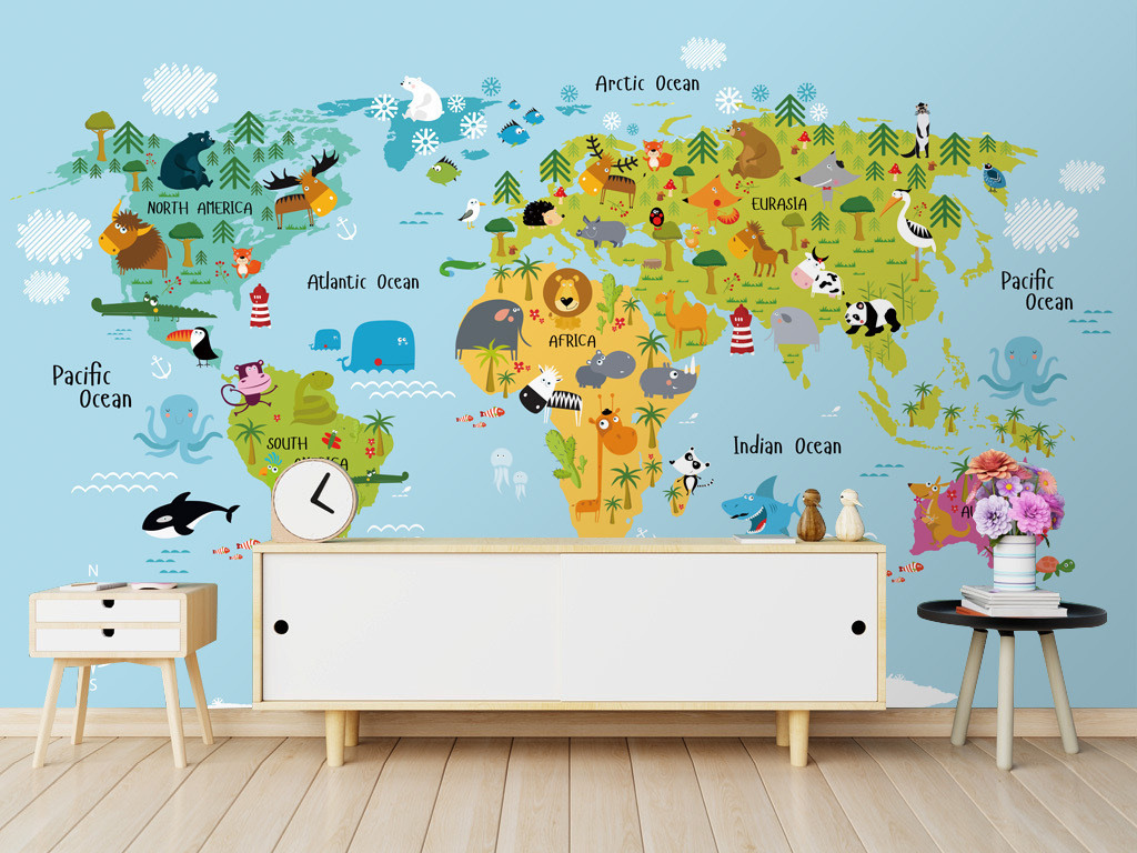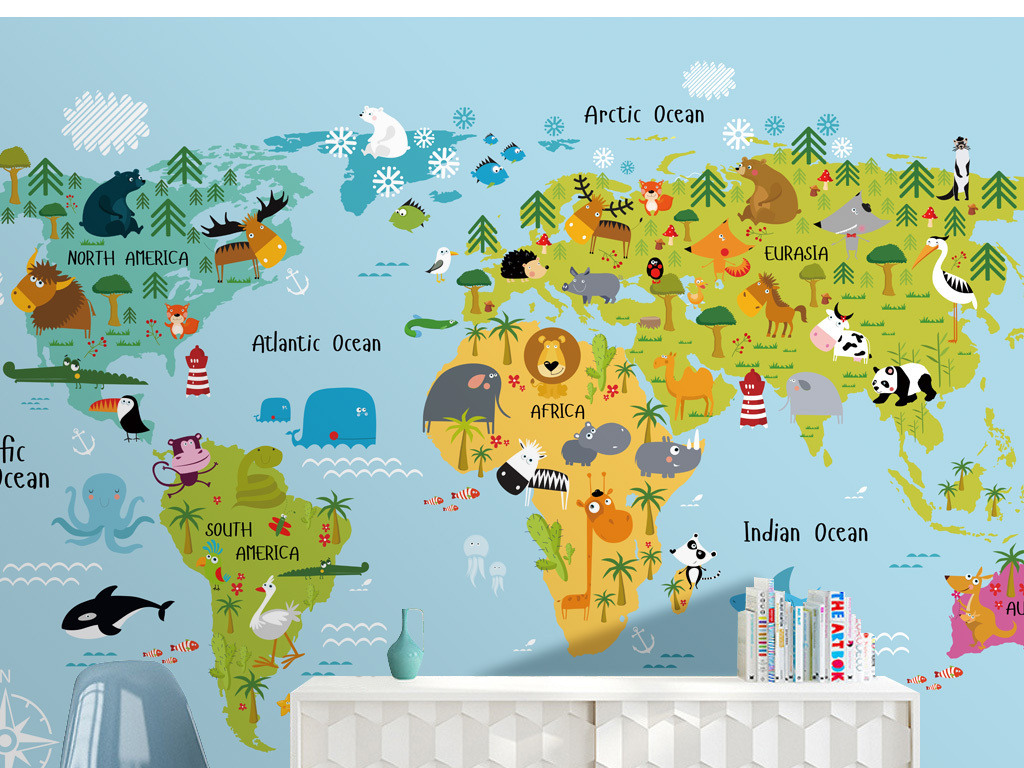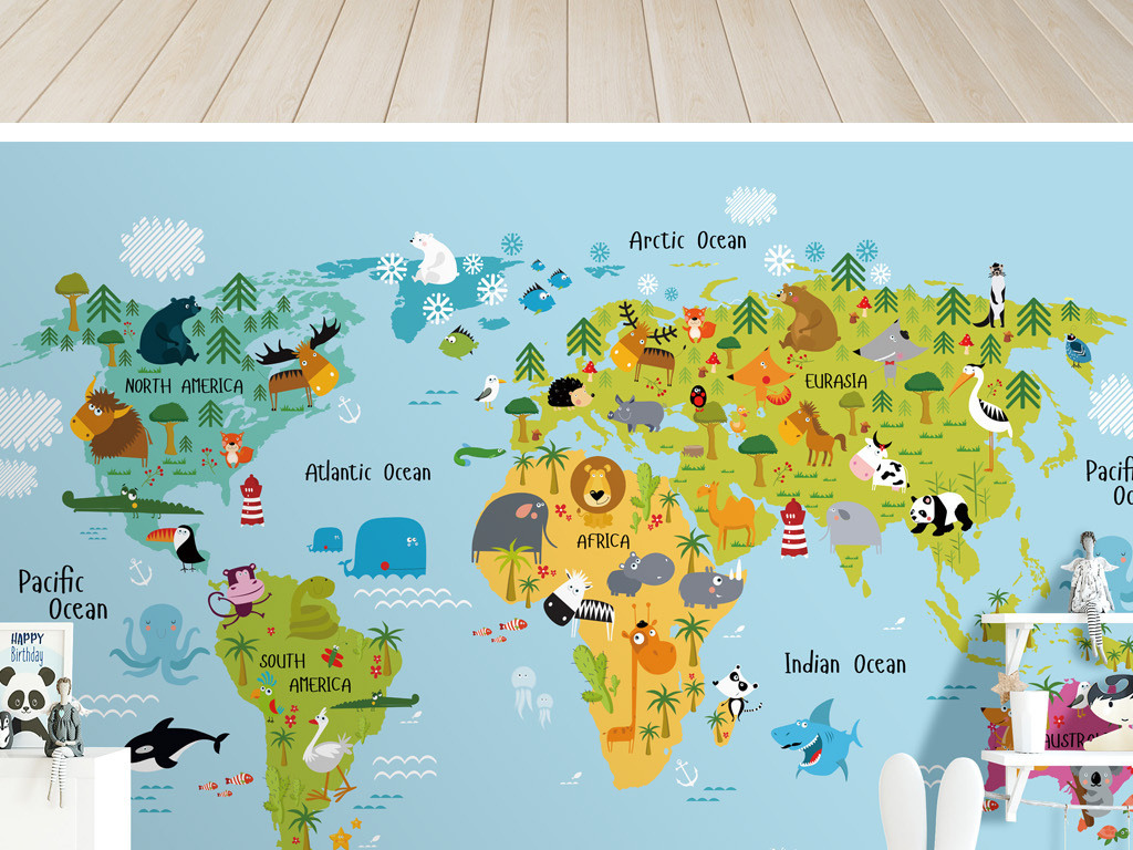 Фотошпалери - Яскрава карта світу та тварини №15646