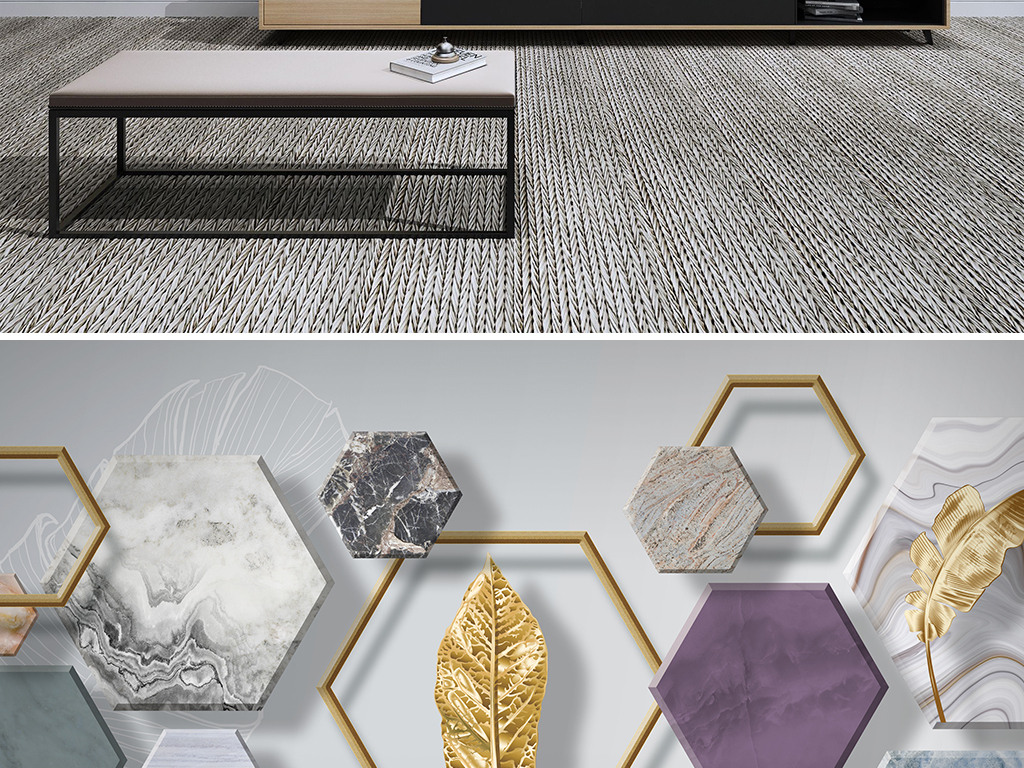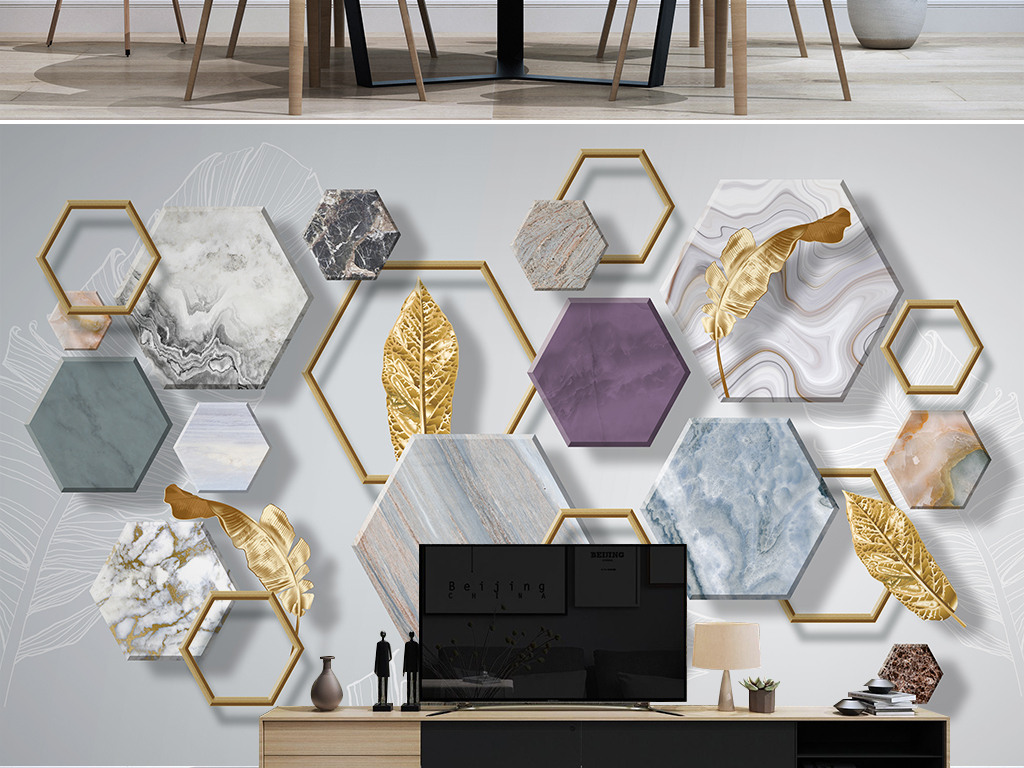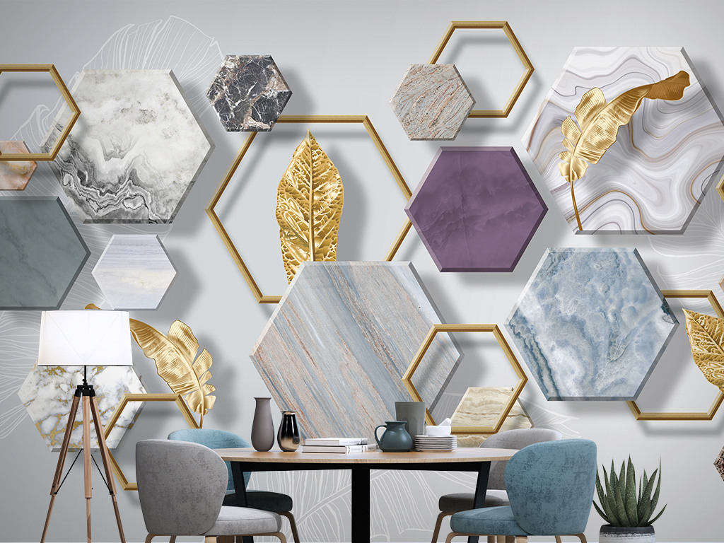 Фотошпалери - Кам'яна геометрія із золотим листям №15982
