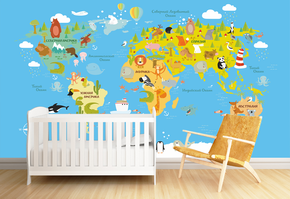 Фотошпалери - Карта світу з тваринами в дитячу №15521