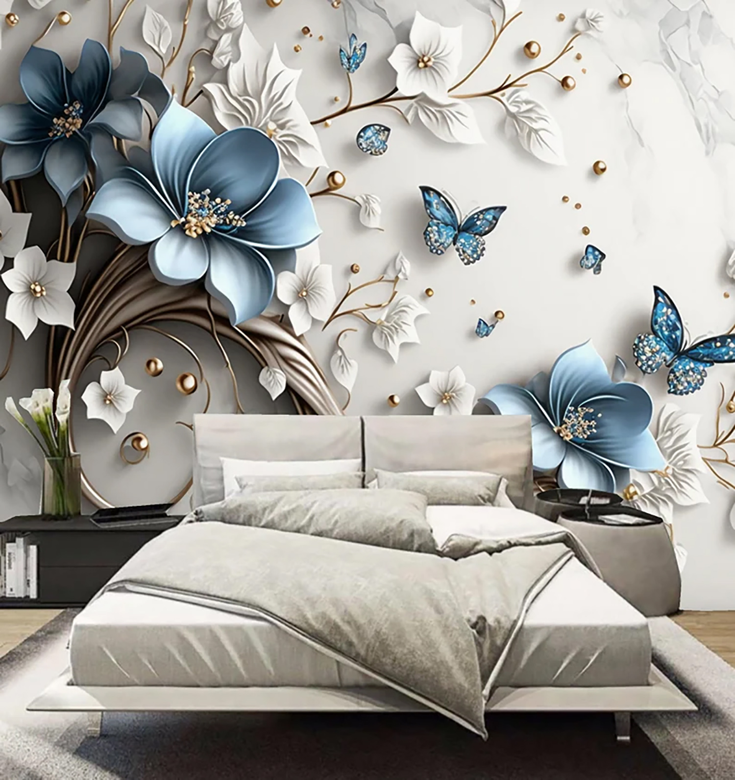 Фотообои - 3D небесно-голубые цветы и бабочки №21597